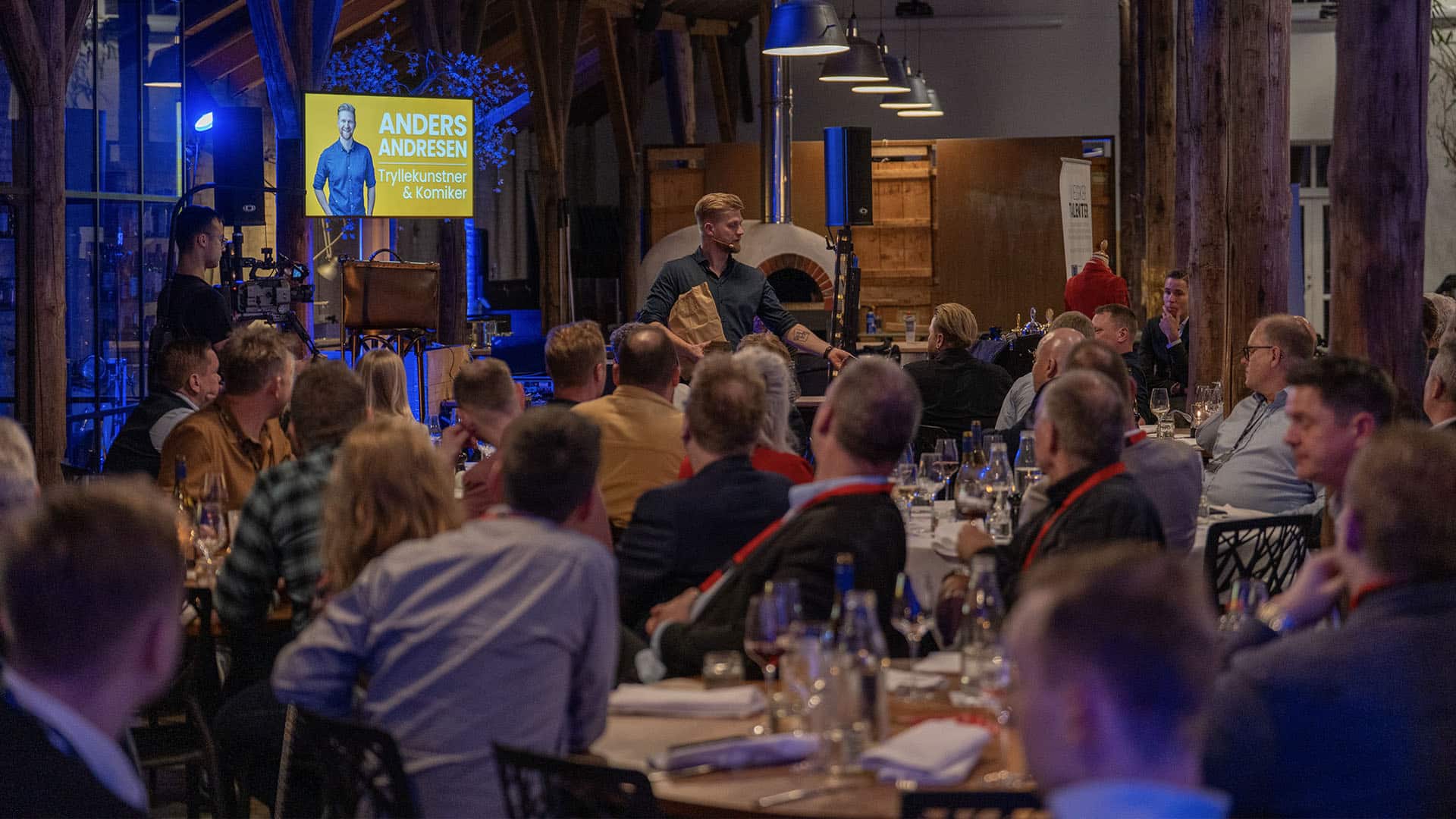 Showet kan tilpasses både intime firmaevents med få gæster og store firmaarrangementer med flere hundrede deltagere. Anders sørger for, at alle – uanset om de sidder forrest eller bagerst – føler sig inkluderet i oplevelsen.